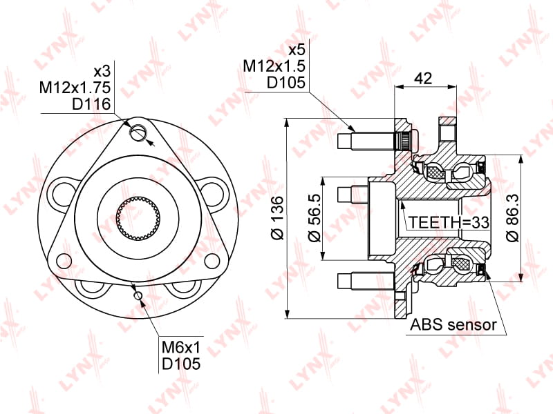 Ступица передняя в сборе (с ABS, ? 136 мм ) CHEVROLET Cruze 1.6-2.0D 09>, OPEL Astra J 1.3D-1. LYNXauto WH-1100